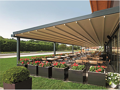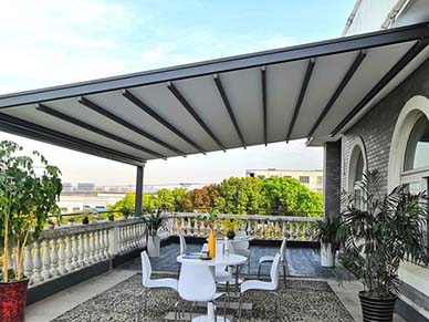 戶(hù)外防水折疊式天幕是可用于室內(nèi)外遮陽(yáng)防雨的天幕系統(tǒng),該產(chǎn)品每組由兩根導(dǎo)軌組成,面料可通過(guò)電機(jī)控制在兩邊軌道內(nèi)移動(dòng),是軌道折疊式天棚與伸縮遮陽(yáng)蓬的升級(jí)結(jié)合體產(chǎn)品,面料伸縮自如的同時(shí)可遮擋陽(yáng)光,閉合后可防水,讓您充分享受生活的愜意。