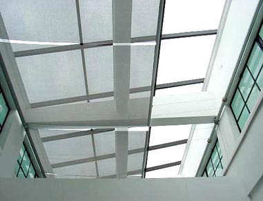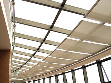 FSS卷軸式天棚簾,即單電機彈性機構天棚簾,該系統(tǒng)專為水平或傾斜遮陽系統(tǒng)而設計,適合于彎曲、傾斜或水平的玻璃天棚。主要由管狀電機和彈性張力系統(tǒng)組成,面料一直經(jīng)受張力,機構一端用一個管狀系列馬達,另一端彈簧機構。