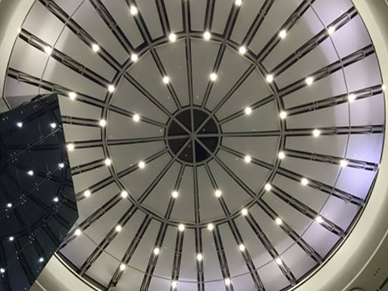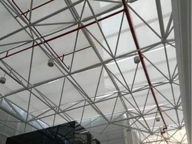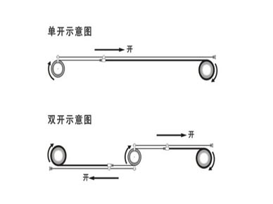FSS卷軸式天棚簾為單開模式,面料展開時會稍有下垂。